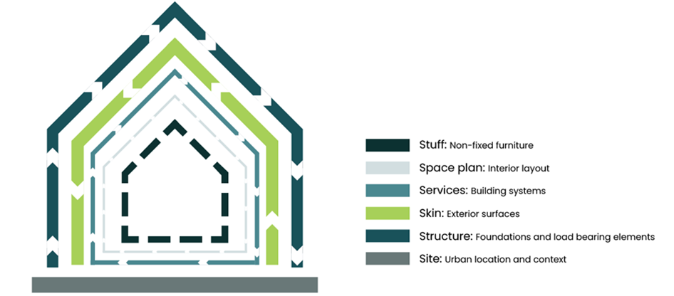 Een tweede belangrijke randvoorwaarde is het toepassen van circulaire principes, immers we willen de klimaatdoelen halen. Onder circulaire principes verstaan we een economie “die gebaseerd is op drie belangrijke pijlers: het verminderen van afval, het verlengen van de levensduur van producten en het sluiten van kringlopen. Dit betekent dat materialen, producten en gebouwen zo worden ontworpen dat ze makkelijk gerepareerd, hergebruikt of gerecycled kunnen worden (Ossio et al., 2023). Door gebruik te maken van circulaire principes zijn verrassende uitkomsten mogelijk, met als kanttekening dat ook dan financiële haalbaarheid veelal de doorslaggevende factor blijft (Verberne et al., 2021). Het Shearing Layers principe van Stewart Brand (1994) is behulpzaam bij het toepassen van een circulaire economie. Volgens Brand bestaat een gebouw uit zes afzonderlijke lagen, elk met een eigen levensduur. Van buiten naar binnen betreft dit: de locatie, de structuur, de schil, de installaties, de ruimte-indeling en de inrichting, zoals weergegeven in Figuur 1. De locatie omvat het terrein waarop het gebouw is gesitueerd en heeft een onbeperkte levensduur. De daaropvolgende laag, de structurele componenten, heeft een levensduur variërend van 30 tot 300 jaar. Toch worden veel gebouwen reeds na circa 69 jaar gesloopt vanwege functionele, economische en esthetische veroudering (Bokhari & Geltner, 2014).